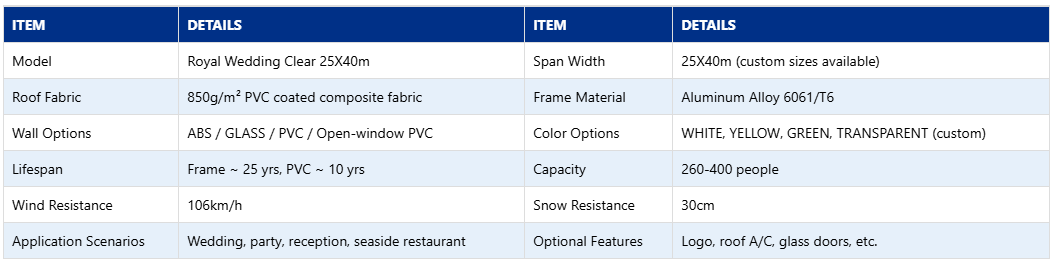 Key Benefit: The Royal Wedding Clear 25X40m combines luxury and practicality, making your wedding unforgettable while saving costs compared to traditional venues.